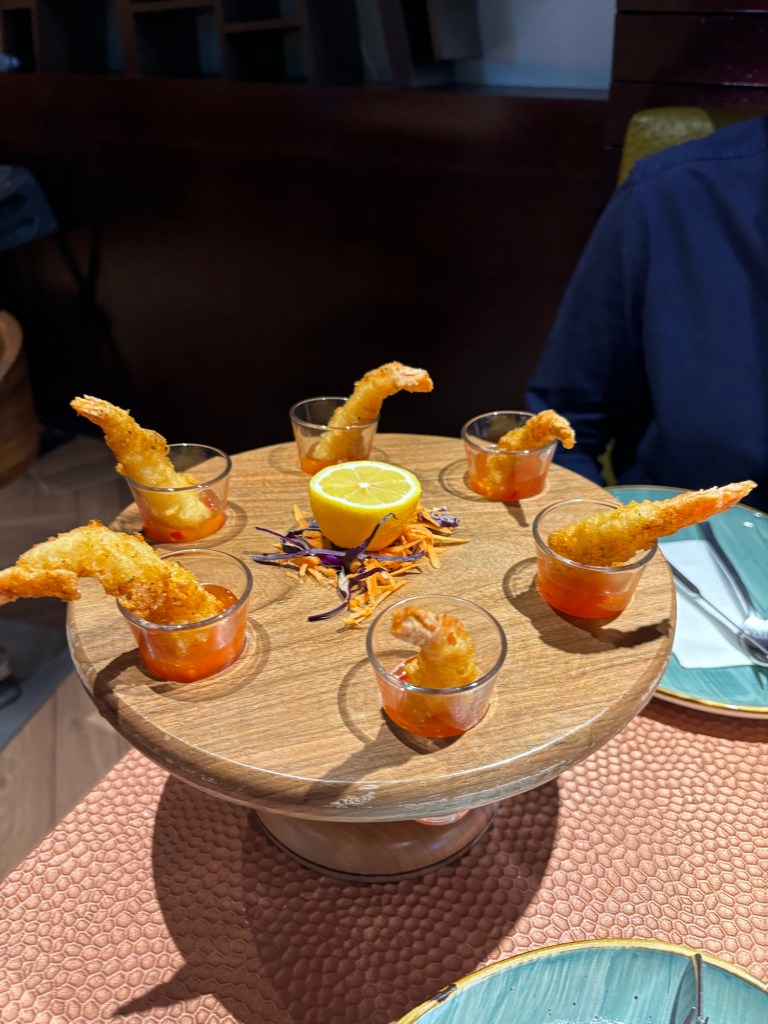We are on our way to a much awaited steak dinner, and yet we cannot resist ordering some nibbles with our drinks, and we go with our waiter’s recommendation of Shrimp Tempura. The shrimps are large and juicy, the fried coating is crispy and dry, not at all oily, and they come whimsically served in a roulette of shot glasses, each pre-dipped in sweet chilli sauce.