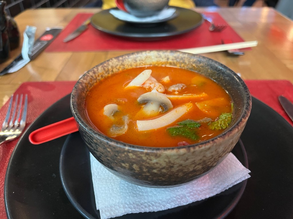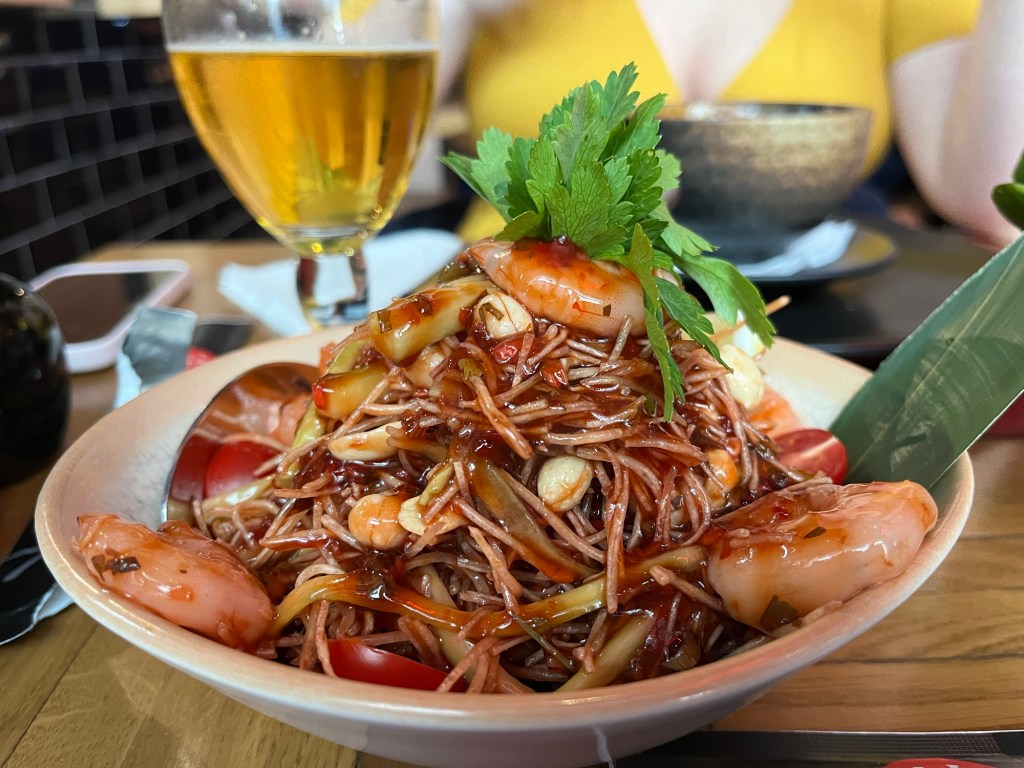 In true post-Covid style, the menu is accessed via QR code and it’s massive, and by that I mean properly massive, huge: we scroll for what seems like hours before even making it our of the ‘Starters’ section. They offer a variety of different Asian cuisines: Chinese, Thai, Japanese… a spectacular smorgasbord of my favourite foods, so by this point I am scrolling up and down the menu trying to fathom how to whittle down my options, as I would gladly eat literally every single item on the menu.